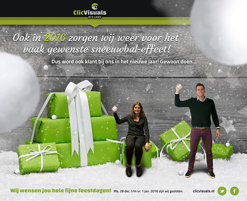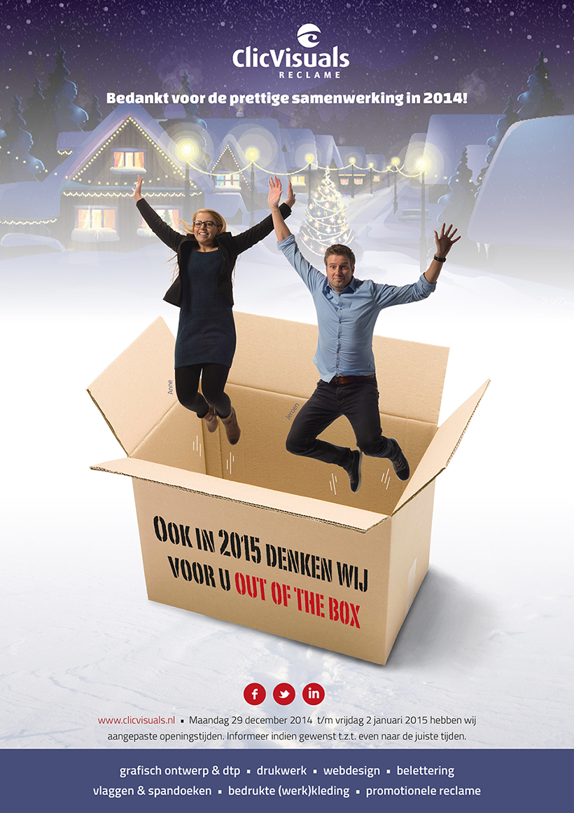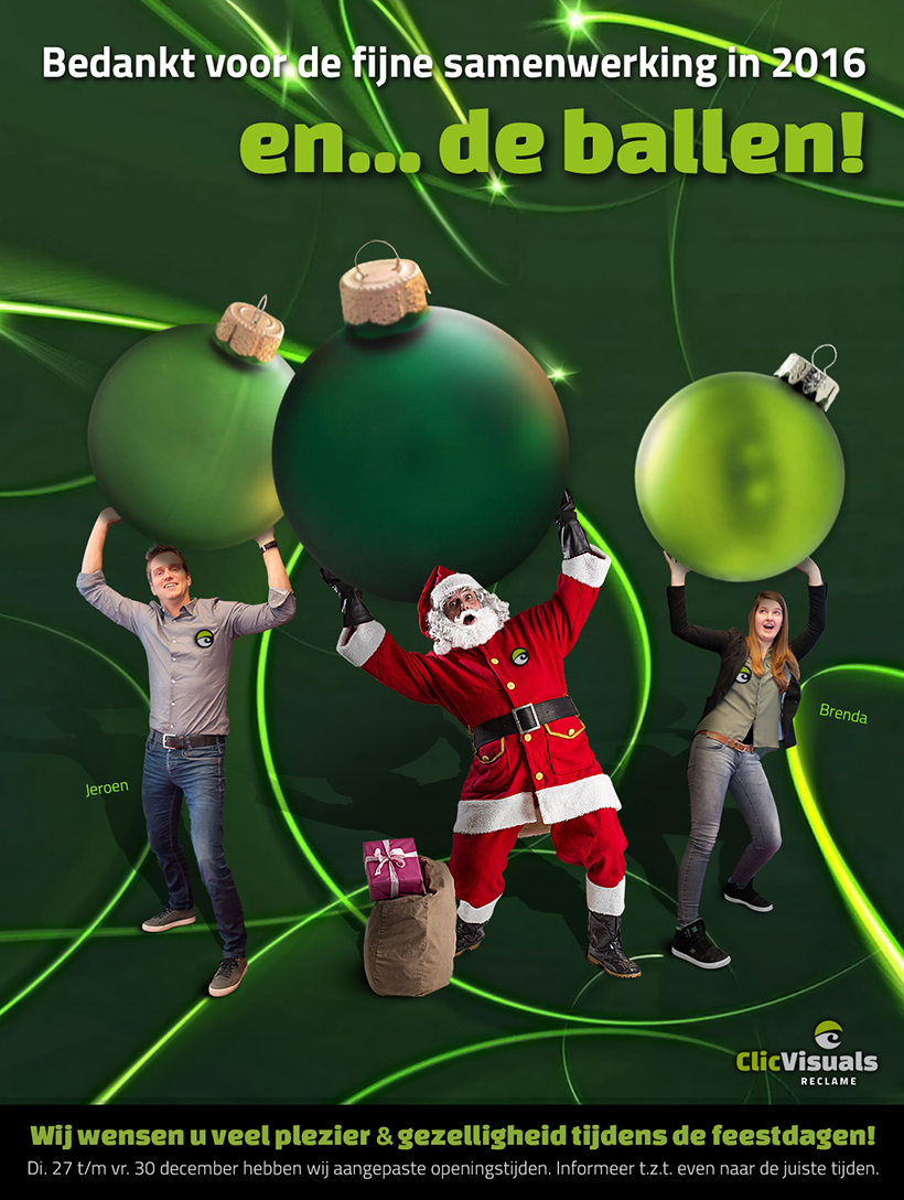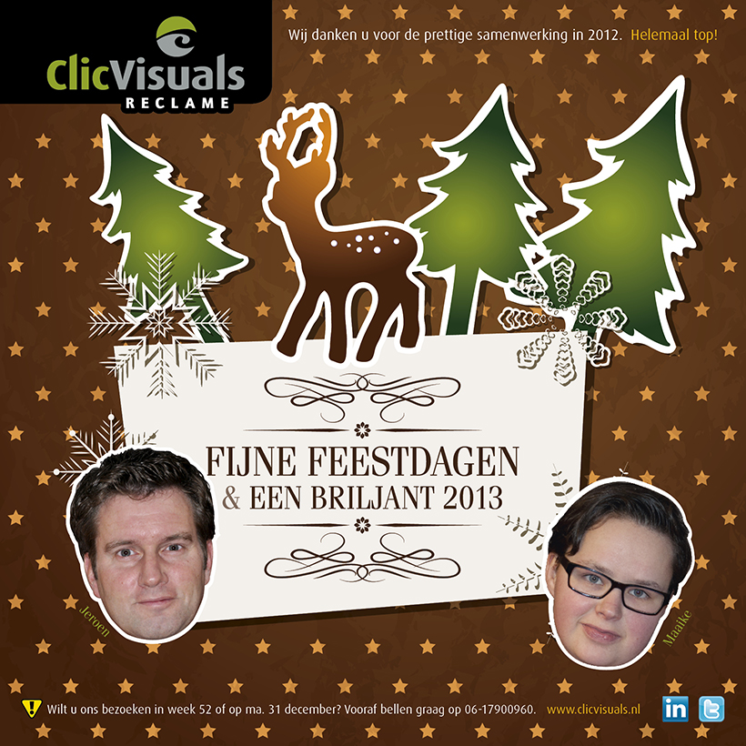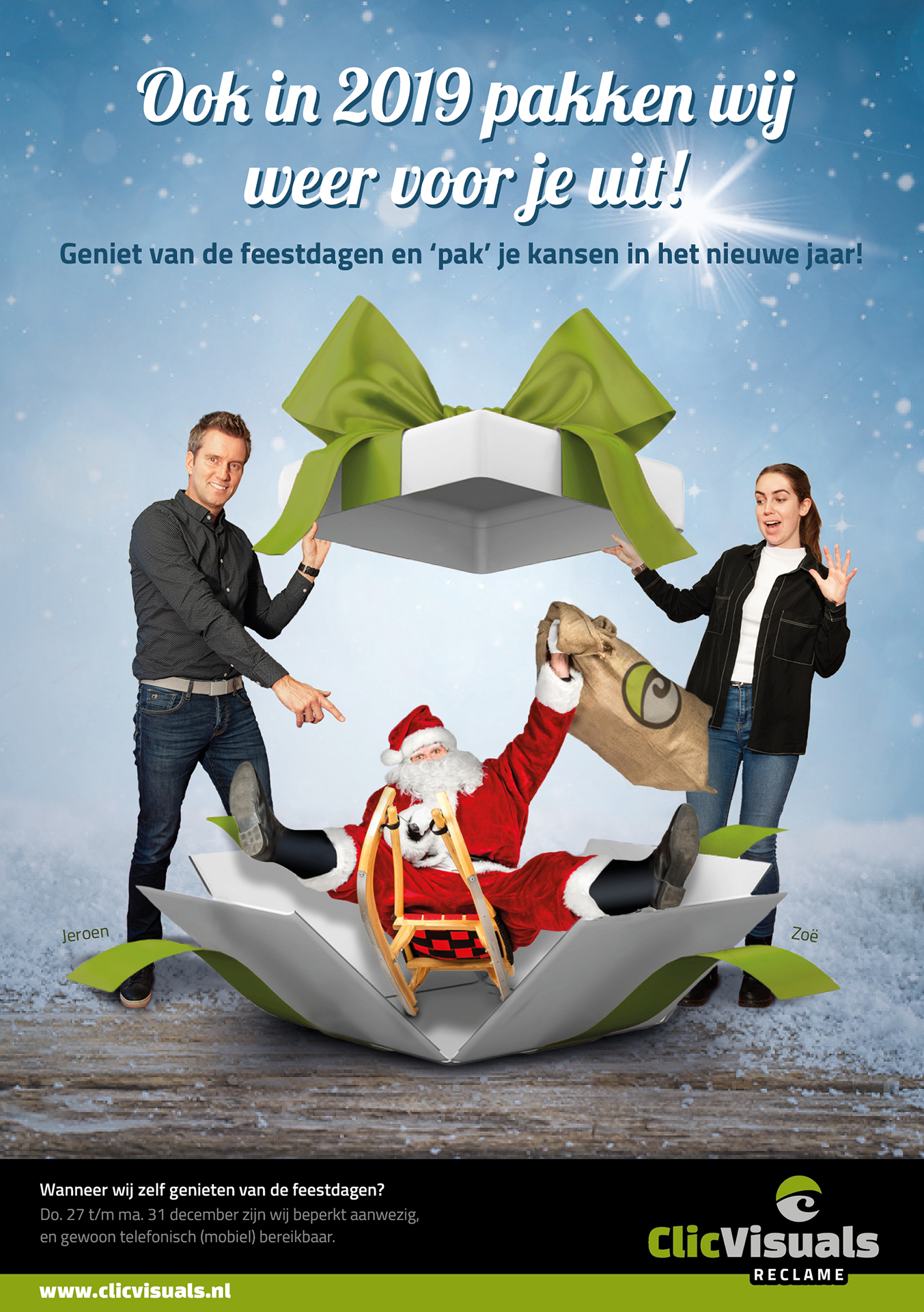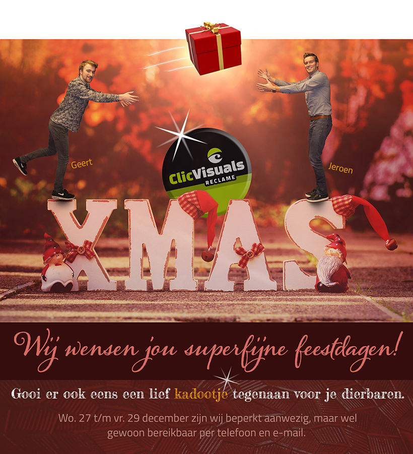 Wil jij ook een mooie, originele, grappige of opvallende kerstkaart (fysiek of digitaal) laten ontwikkelen voor jou of jouw bedrijf, vereniging of instelling? Dan moet je bij Clic Visuals Reclame zijn. Zeker weten dat er dan iets moois uitkomt.